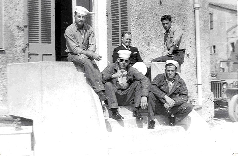 SNJ Crew at Cannes Airfield April 1953 L-R - R. Milburn, Joe Sinking, Toman, (Rear) CPO Broulette, Bob Allwine - courtesy of Bob